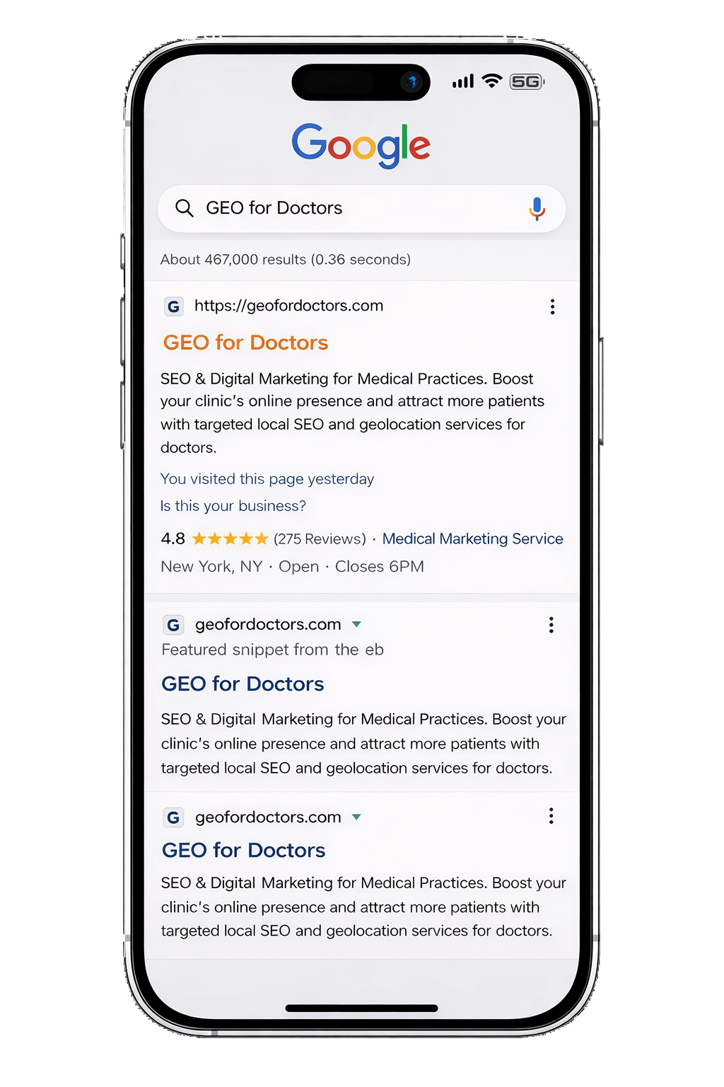 Is your medical practice prepared to be discovered when patients search through Google and AI-powered platforms? GEO for Doctors specializes in Generative Engine Optimization and Local SEO — helping your practice strengthen visibility, build lasting credibility, and connect with patients actively seeking care. Our strategic approach positions your expertise where healthcare decisions begin, supporting consistent patient acquisition and long-term practice growth.